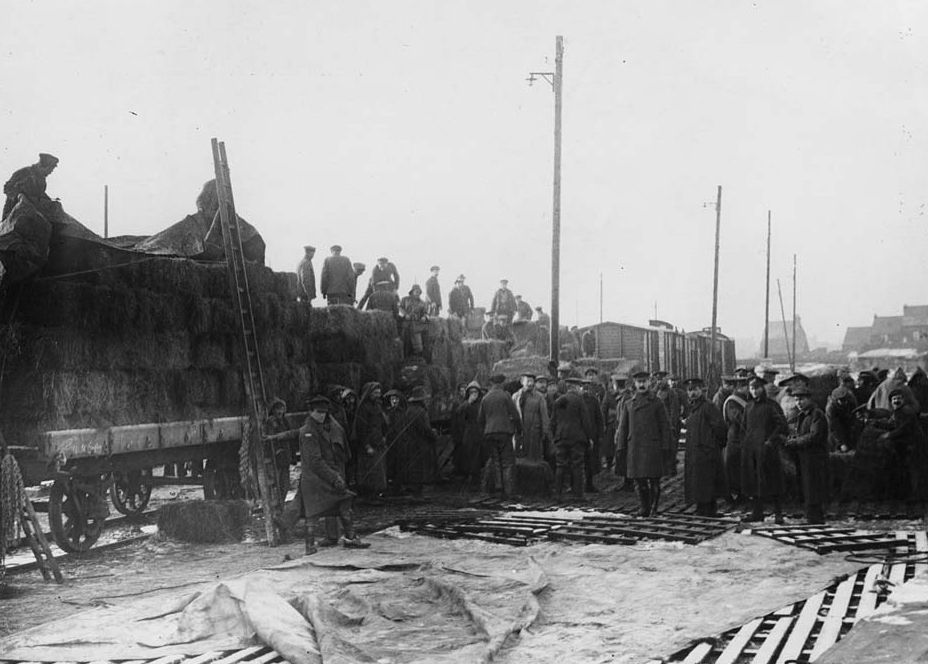 ![]() A railhead 'somewhere in France'. Fodder for the millions of horses in use by the army used up a largeproportion of the available transport. |