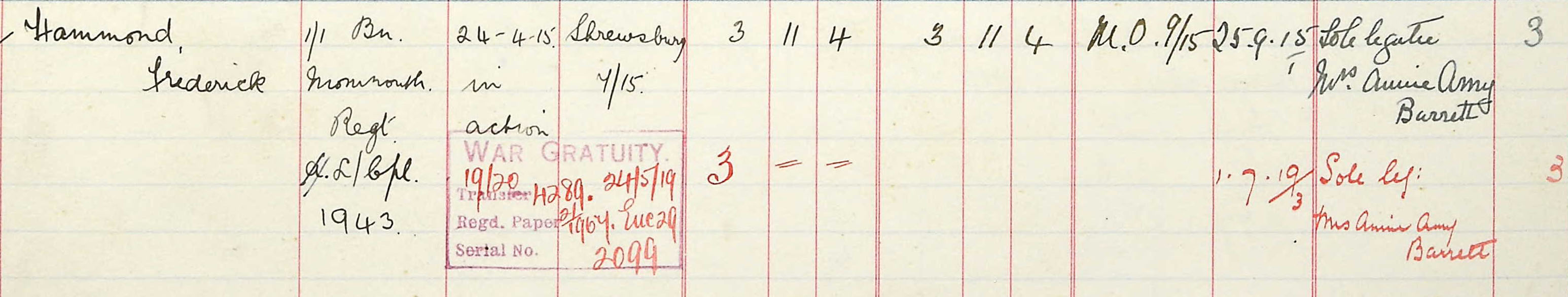 Frederick's entry in the Register of Soldiers' Effects, which shows Mrs Annie Barrett as his sole legatee - who was Annie? |