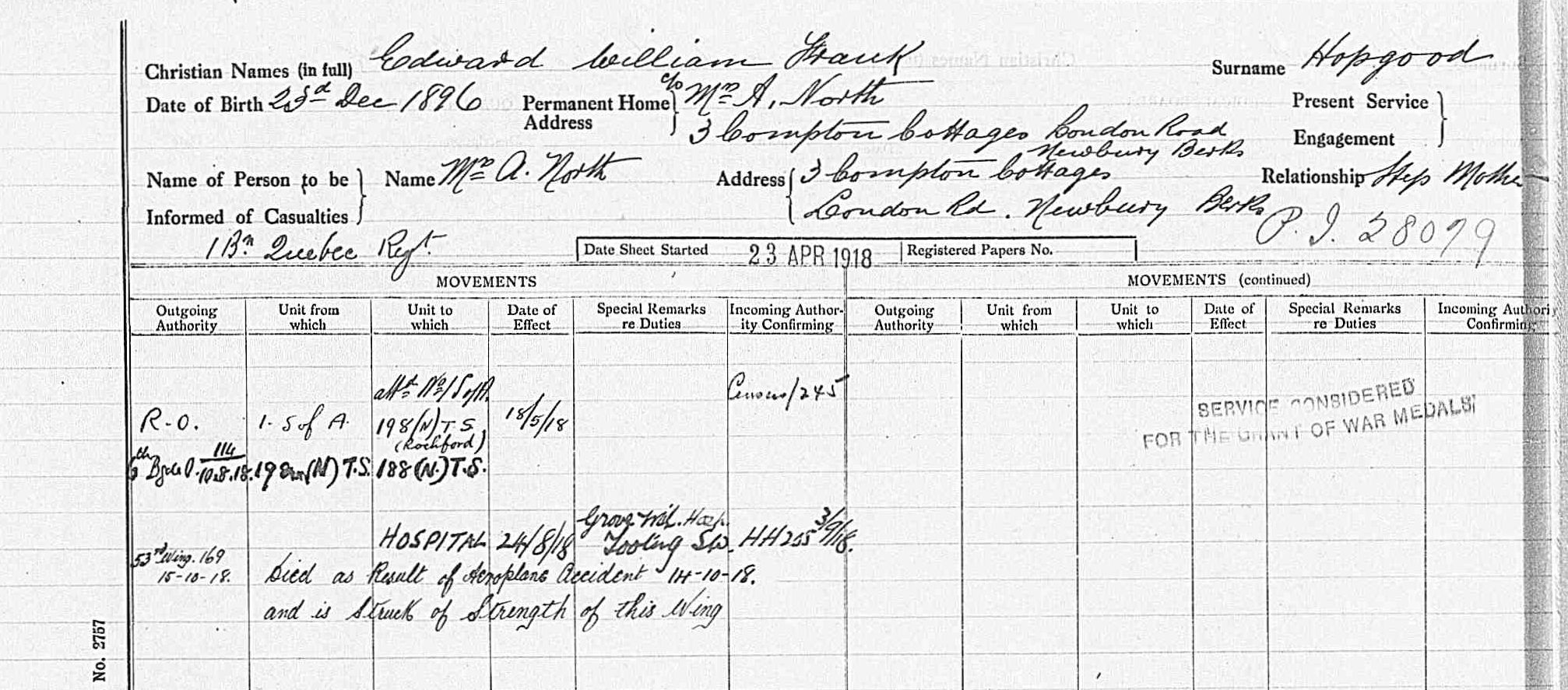 Lieutenant Edward William Frank Hopgood, 87th Battalion Canadian Infantry, attached 188th Light Training Squadron, Royal Air Force