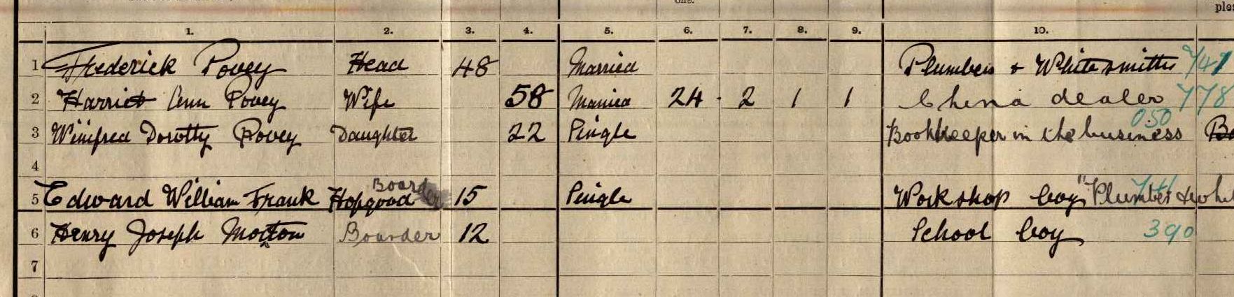 ![]() The Povey's 1911 census entry, showing Frank as an employee. |
